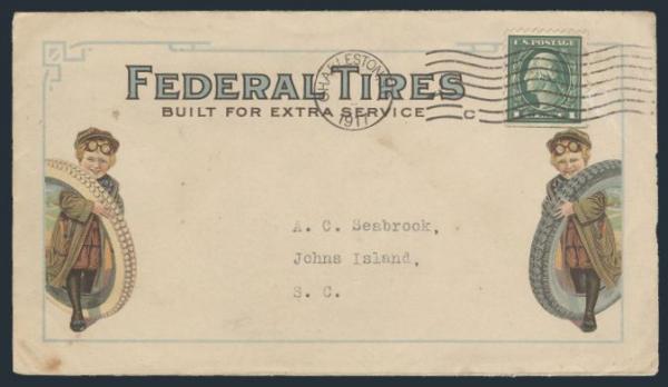 by Charleston, SC 1917 cancel & multi-colour illustrated advertising cover for Federal Tires. Depicts young drivers holding tires. Addr to Johns Island, SC. F-VF
