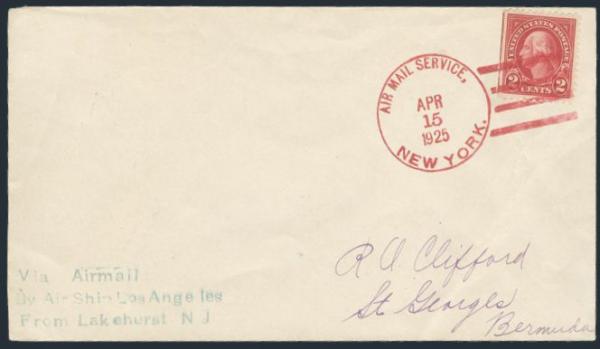 by red Air Mail Service New York 15 Ap, 1925 on cach cover flown on the "LOS ANGELES" ZEPPELIN AIRSHIP to Bermuda (rec b/s). F (Image)