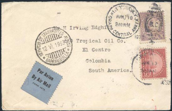 Tied by New York 10 June 1933 duplexes paying 70¢ rate on airmail cover to COLOMBIA. Has 2 diff cancels on front and back of the Colombian Air Services. F (Image)