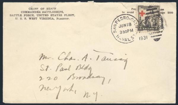 by San Pedro, Calif / Naval Sta 18 June 1931 duplex cancel on Penalty envelope with "Chief of Staff, Commander Battleships U.S.S. West Virginia, Flagship" corner card. Sent by Rear Admiral J.K. Taussig to a relative in New York. Reprimanded by