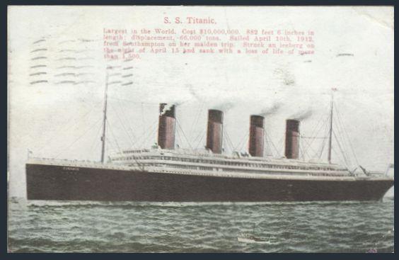 by Grand Central Stn, New York 18 Sept 1912 cancel on coloured postcard depicting the ill-fated "SS TITANIC". It was the largest & most luxurious liner in the world. It sunk on its maiden voyage 15 April, 1912 with the loss of 1,500 lives. F, corner