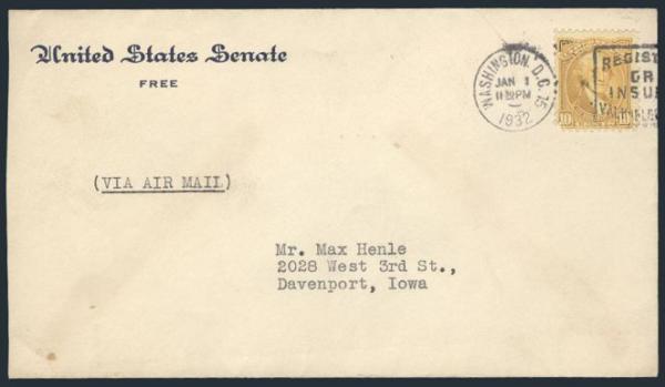 Complete Washington Bicentennial set of 12 diff tied by Washington DC 1 Jan, 1932 cancels on 9 FDC's. Each FDC has "UNITED STATES SENATE" corner card & is addr to Iowa. F, some mounting stains on reverse (Image)