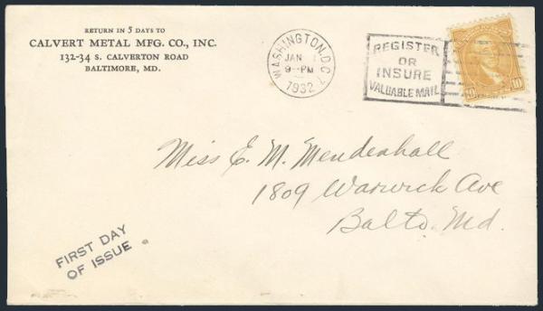 Complete Washington Bicentennial set of 12 diff tied by matching Washington DC 1 Jan, 1932 slogan cancels on separate FDC's. All with matching Calvert Metal Mfg Co. corner cards & addr to Baltimore. F-VF (Image)