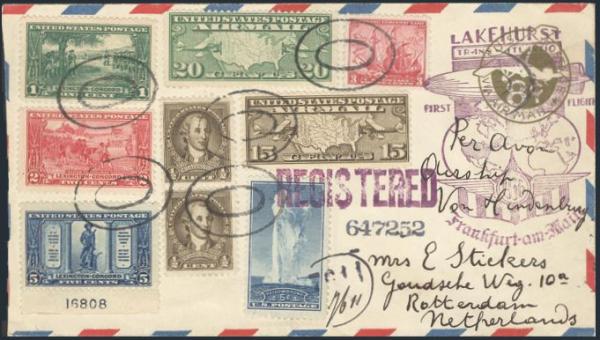 C8-9, Nine stamp franking tied by oval cancels on cach HINDENBERG ZEPPELIN FIRST FLIGHT cover 5 Sept, 1936 to Germany (rec Zeppelin illustrated b/s). Addr to Rotterdam, Netherlands. VF (Image)