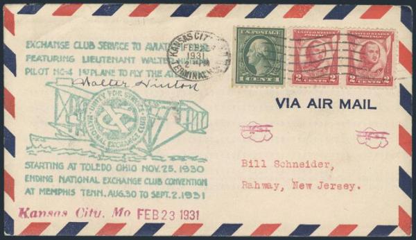 (Pair), Tied by Kansas City 25 Feb 1931 cancel on cach airmail cover autographed by famous American Pilot WALTER HINTON. He achieved fame as one of the 2 pilots of the flying boat "NC-4" to make their first Trans-Atlantic flight in 1919. VF (Image)