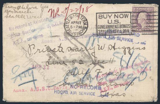 by Seattle 17 Apr 1918 slogan cancel on WWI cover to a private at Shelly Field, San Antonio, Texas. Redirected several times with red, violet & blue h/s's incl "NO RECORD / HDORS AIR SERVICE", No record at "Aviation Section / Base Section 3, SOS /