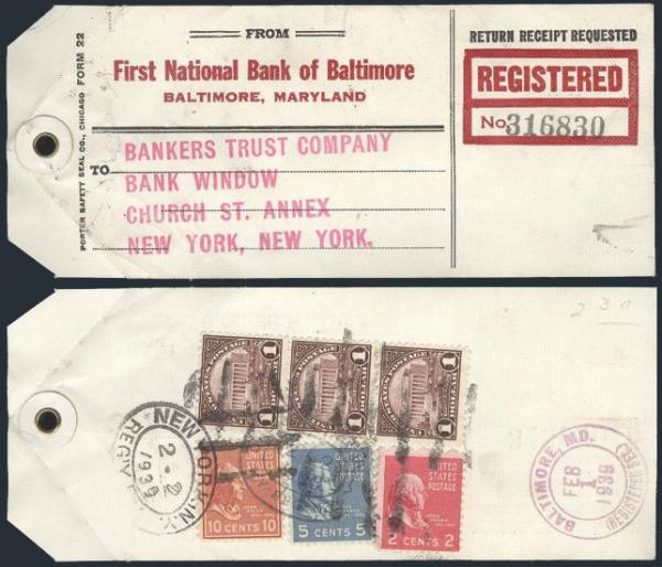 806, 810, 815, Tied on Reg'd BANK TAG 1 Feb, 1939 from First National Bank of Baltimore to Bankers Trust Co. in New York. F (Image)
