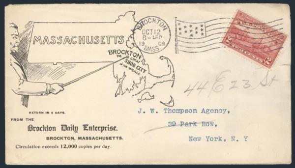 by Brockton Mass 12 Oct, 1909 Flag cancel on pretty illustrated Newspaper advertising cover for Brockton Daily Enterprise. Addr to New York. F, small edge tear