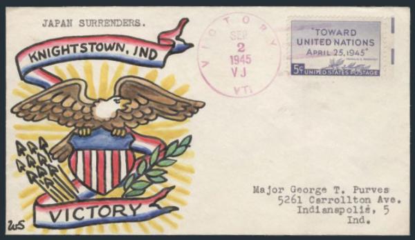by purple VICTORY, Vt 2 Sept 1945 duplex cancel on V-J DAY handpainted cach SURRENDER of JAPAN WWII cover. Depicts USA crest. Painted by W. Stawuszewski & has letter enclosed signed by the artist. VF. Splendid item (Image)