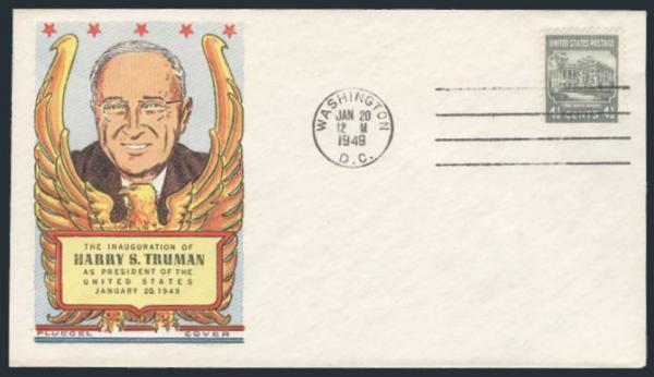 by Washington, DC 20 Jan 1949 cancel on colour illustrated Fluegel cach INAUGURATION of PRESIDENT HARRY TRUMAN. Depicts the President & Eagle. VF, unaddr (Image)