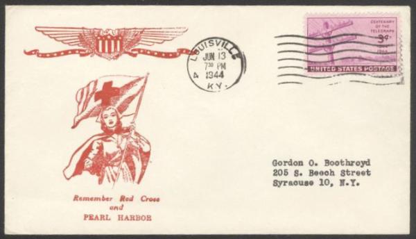 by Louisville, Ky 13 June 1944 cancel on WWII red cach Patriotic cover to Syracuse, NY. Has slogan "Remember Red Cross & PEARL HARBOR". Shows Nurse holding Red Cross Flag & USA Crest. VF (Image)