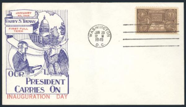 by Washington, DC 20 Jan 1949 cancel on red & blue illustrated Knapp / Richardson cach INAUGURATION of PRESIDENT HARRY TRUMAN cover. Depicts President taking oath, capital Hill & Eagle. VF, unaddr (Image)