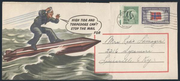 Tied by Saint Paul Minn 21 Dec 1944 cancel on #10 WWII colour illustrated Patriotic cover to Louisville, Ky. Depicts sailor riding a torpedo. F, folded (Image)