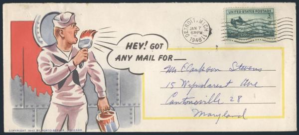 by Detroit 7 Jan 1946 cancel on #10 WWII colour illustrated Patriotic cover to Cantonsville, Maryland. Depicts sailor painting a ship. F-VF (Image)