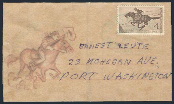 Express 4¢ stamp tied by special blue Pony Express h/s on re-enactment F/L with red seal on reverse. Has HAND DRAWN illustration of a PONY EXPRESS RIDER. F (Image)