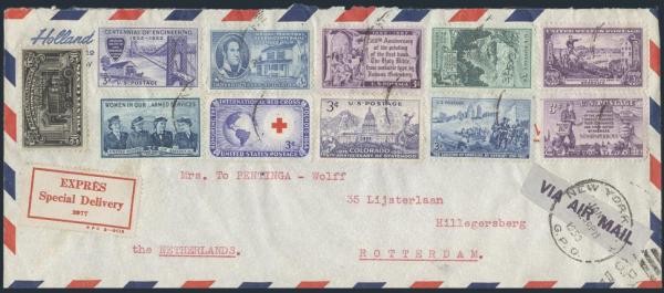 C35, E19, Tied on 4 multi-franked (29 stamps, 23 diff) #10 Airmail Express covers 1952-3, from New York to Netherlands. Each with Holland-America Line corner cards, mailed by the purser aboard the ship "M.V. Noordam". F-VF (4) (Image)