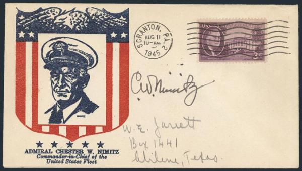 by Scranton PA 11 Aug 1945 cancel on WWII Patriotic cover with coloured cachet depicting ADMIRAL CHESTER NIMITZ. The cover is autographed in pen by him. He played a major role in the naval history of WWII as Commander in Chief of the US Pacific