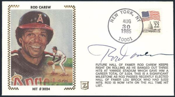 by New York 30 Aug 1985 cancel on silk cacheted cover autographed by famous California Angels Baseball player ROD CAREW. VF. Has PSA Certificate of Authenticity