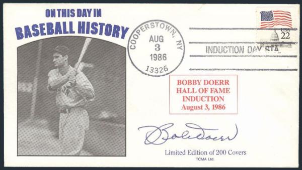 by Cooperstown, NY 3 Aug 1986 cancel on cacheted Hall of Fame Induction Day cover commemorating Boston Red Sox great BOBBY DOERR and signed by him. VF (Image)