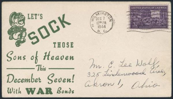 by Wilmington Del 7 Dec 1944 cancel on patriotic cachet "LET'S SOCK THOSE SONS OF HEAVEN THIS DEC SEVEN! WITH WAR BONDS". This was the 3rd Anniversary of Pearl Harbor. VF