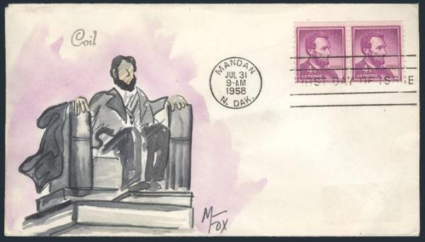 Pair tied by Mandan ND 31 July, 1958 cancel on FDC. Has ARTIST DRAWN cachet by Fox. VF, corner bend (Image)