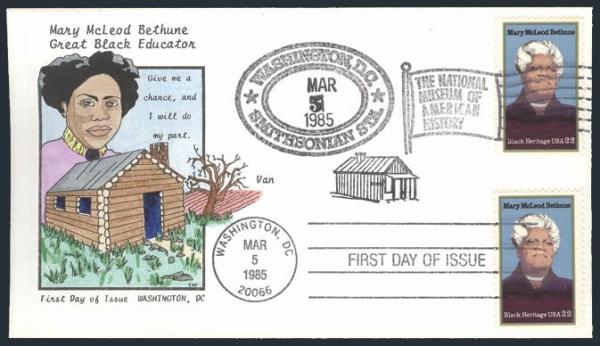 Mary McLeod Bethune FDC 5 Mar, 1985 FDC with ARTIST DRAWN colour cachet. Signed by the artist on reverse. VF (Image)