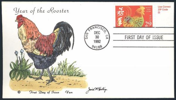 of the Rooster FDC 30 Dec, 1992 with ARTIST DRAWN colour cachet. Signed by the Artist on reverse. VF (Image)