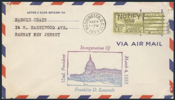 by Washington, DC 4 Mar 1933 slogan cancel on bi-colour cach INAUGURATION of PRESIDENT F.D. ROOSEVELT airmail cover. Depicts Capital Hill. VF, unaddr (Image)