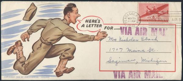 by Pensacola, Fla 25 Nov 1942 Naval Air Station cancel on #10 WWII colour illustrated Patriotic airmail cover to Saginaw, Mi. Depicts soldier on the run with caption "Here's a letter for". Also similar cover illustrated in red from Caracas, Venezuela