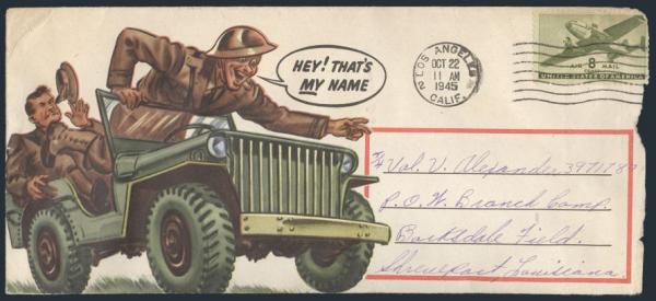by Los Angeles, Ca 22 Oct 1945 cancel on #10 WWII colour illustrated Patriotic airmail cover to Shreveport, La. Depicts comic scene of soldier & officer in a jeep. F-VF, roughly opened (Image)