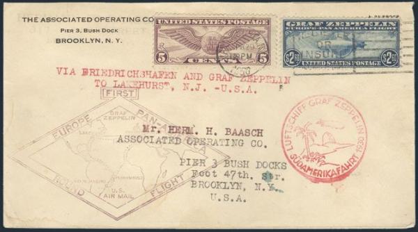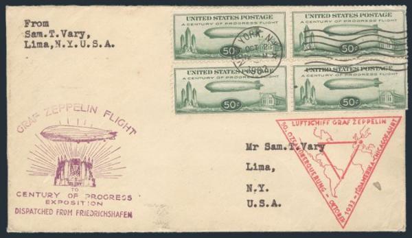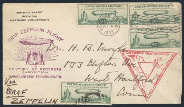 singles), Tied by New York 2 Oct, 1933 cancel on GRAF ZEPPELIN FLIGHT COVER. Has Century of Progress Expo cachet dispatched from Friedrichshafen, plus red triangular South America Zeppelin flight cachet. F, minor scuffing on one stamp (Image)