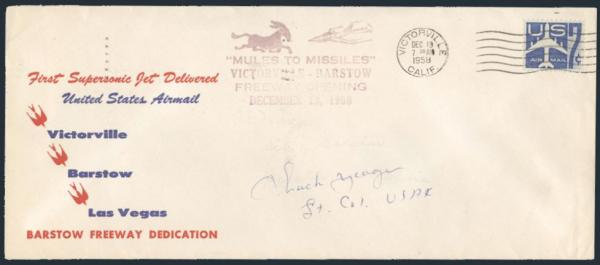 by Victorville, Calif 13 Dec 1958 cancel on large size cacheted cover commemorating the First Supersonic Jet Delivered & Barstow Freeway Dedication . Has been signed by legendary American Air Force Pilot CHUCK YEAGER. He was a record-setting test