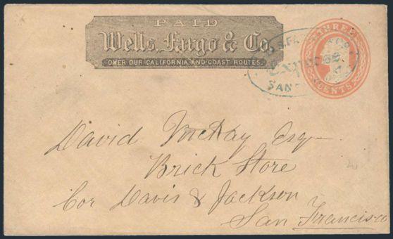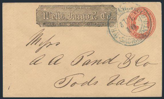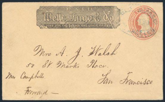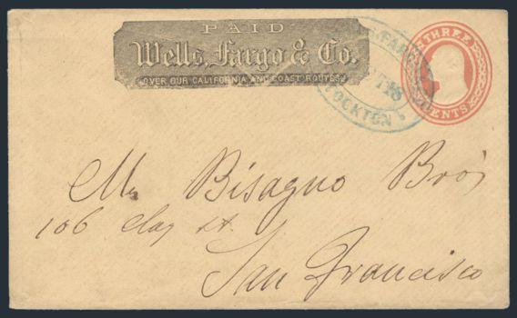 "Wells, Fargo & Co. / Paid" imprint & blue oval circa 1850's Wells, Fargo & Co. / Express Co. / Express / San Francisco cancel addr locally. F, flap flt (Image)