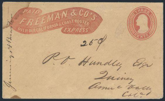 red "PAID / FREEMAN & Co.'s / EXPRESS" imprint on cover circa 1859. On reverse has "Jennings & Hewster Clothing Warhouse, San Francisco" h/s on flap. Addr to Quincey, Calif. F, couple small stain spots (Image)