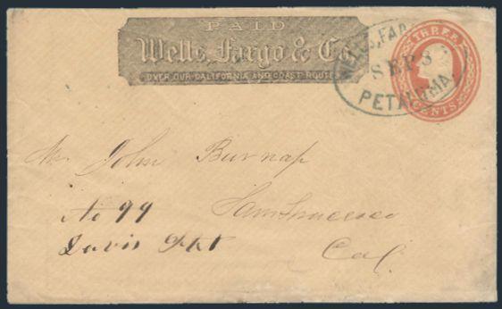 "Wells, Fargo & Co. / Paid" imprint & blue oval Petaluma cancel circa 1850's, to San Francisco. F (Image)