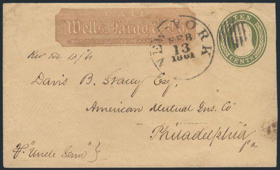 red brown "Wells, Fargo & Co. / Paid" imprint & New York 13 Feb 1861 duplex cancel to Philadelphia, per "Uncle Sam". F, small stain spot (Image)