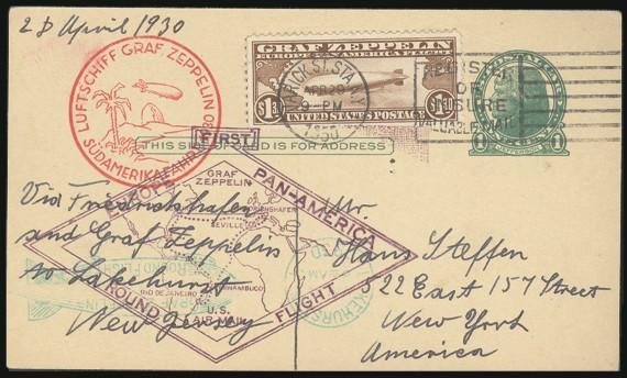 Zeppelin tied by Varick St. Sta NY 29 April 1930 slogan cancel on cacheted ROUND THE WORLD GRAF ZEPPELIN FLIGHT postal card. VF (Image)