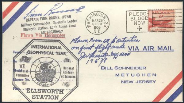 on cach Punta Arenas, Chile to Ellesworth Station Antarctic Mar 1958 FFC addr to NJ. Signed by Captain F. Ronne, Military Commander / Scientific Leader of the Ellesworth Station. VF. A nice Antarctic cover (Image)