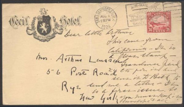 San Francisco 7 Aug, 1924 airmail slogan cancel on cover to Rye, New York. Has corner card for the Cecil Hotel in San Francisco. F, centre fold, small opening flt
