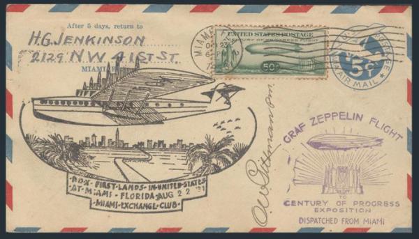 by Miami 23 Oct, 1933 cancel on cach GRAF ZEPPELIN Flight Postal Stationery cover to the Century of Progress Expo in Chicago (rec b/s). Has rare cachet depicting the DORNIER DO-X seaplane. Has been Postmaster signed. F, some TS on stamp perfs (Image)