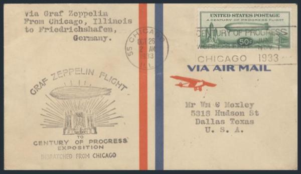 by Chicago 26 Oct, 1933 slogan cancel on cach GRAF ZEPPELIN FLIGHT COVER to Friedrichshafen, Germany (rec b/s). VF (Image)