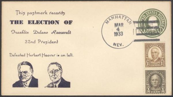 Postal Stationery envelope with #'s 551 & 684 affixed & Manhattan, Nev 4 Mar 1933 Election cover. Depicts portraits of President Hoover (defeated) & President F.D. Roosevelt (elected) cach. VF, unaddr (Image)
