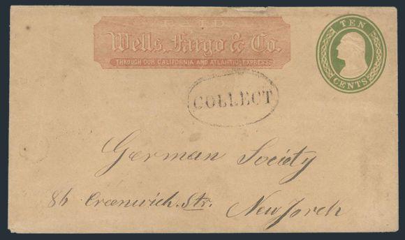 red brown "Wells, Fargo & Co. / Paid" imprint circa 1850's. Addr to New York with "COLLECT" in oval h/s. F, flap flt. Scarce (Image)
