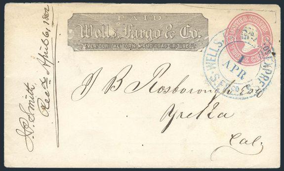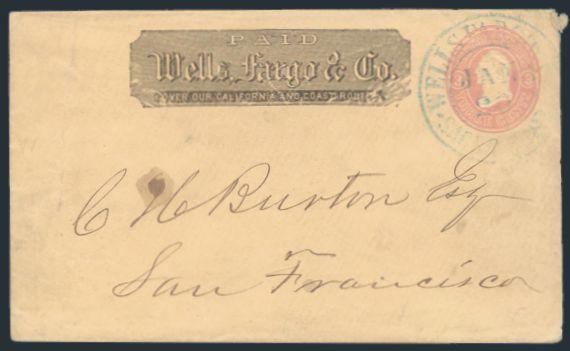 "Wells, Fargo & Co. / Paid" imprint & blue 2-Ring Wells, Fargo & Co. Express / S. FR. Co. 1 Apr cancel to Eureka, Calif. Has m/s 1862 date. F (Image)