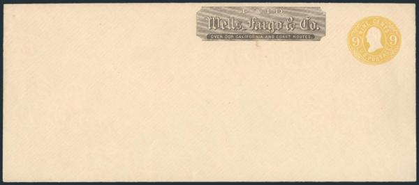 circa 1864 9¢ Washington issue with "Wells, Fargo & Co. / Paid" imprint. VF (Image)
