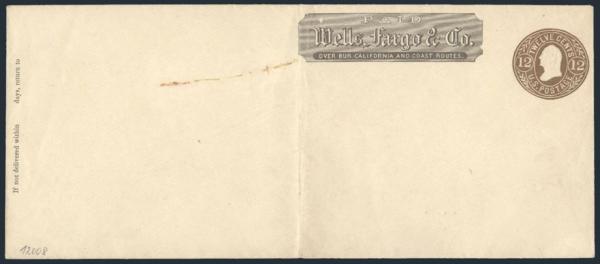 circa 1864 12¢ Washington issue with "Wells, Fargo & Co. / Paid" imprint. F-VF, centre fold (Image)