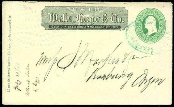 "Wells, Fargo & Co. / Paid" imprint cancelled by blue oval from 1874. Has embossed corner card from a Commission Merchant in Portland Oregon & addr to Roseburg Oregon. Has original letter still enclosed. F-VF (Image)