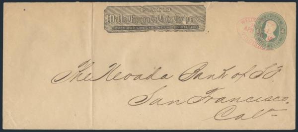"Wells, Fargo & Co. / Paid" imprint & red oval Wells, Fargo & Co. / Virginia City, Nev 20 Apr 1887 oval cancel. Has matching red wax seal on reverse to San Francisco with violet Wells Fargo, San Fran b/s. F, vertical fold (Image)