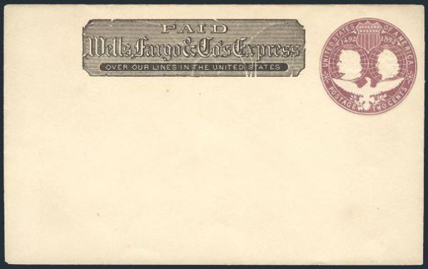 Unused Columbus / Liberty 2¢ issue with "Wells, Fargo & Co. / Paid" imprint. VF (Image)
