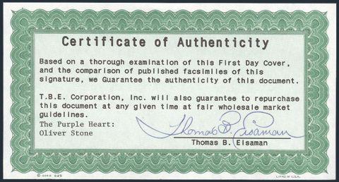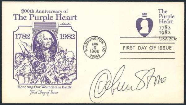 Cacheted "Purple Heart" 20¢ postal stationery envelope with Washington DC 6 Aug 1982 F.D. cancel & illustrated cachet. Has been autographed by famous American film maker OLIVER STONE. He achieved prominence for his movies like Platoon, Scarface, Born